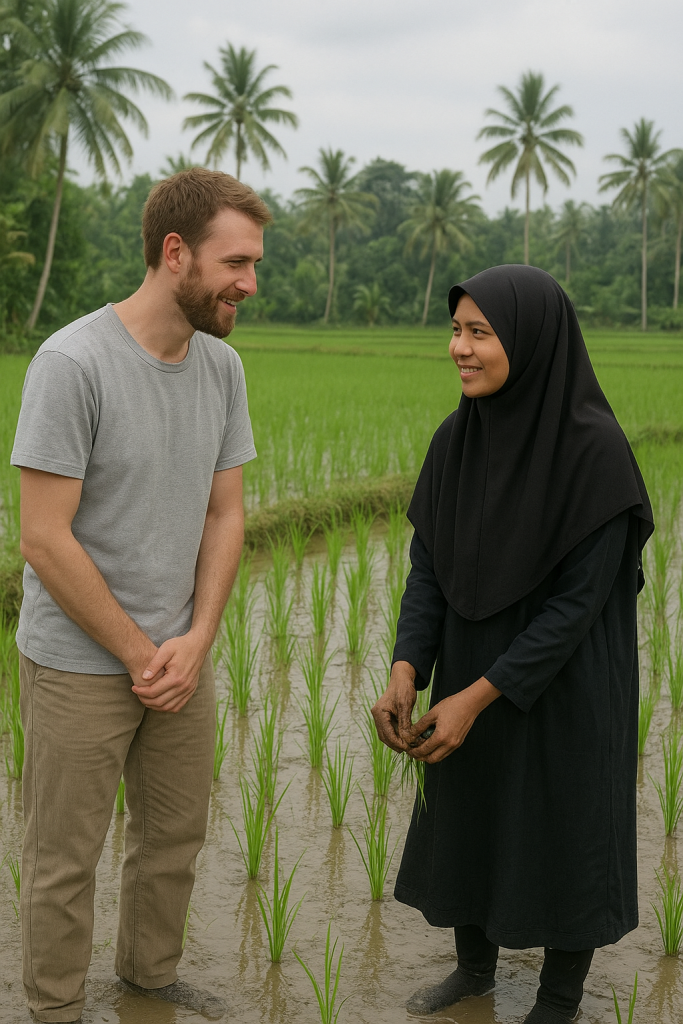 Bali, Indonesia — Di tengah hijaunya hamparan sawah di Ubud, Bali, sebuah kisah mengharukan menyentuh hati banyak orang. Seorang pria bule asal Australia yang baru saja memeluk Islam, tanpa sengaja bertemu dengan seorang wanita muslim yang tengah menanam padi. Wanita itu tampak sederhana, memakai jilbab lebar, pakaian longgar, dan sepasang kaos kaki hitam yang kontras dengan lumpur sawah.